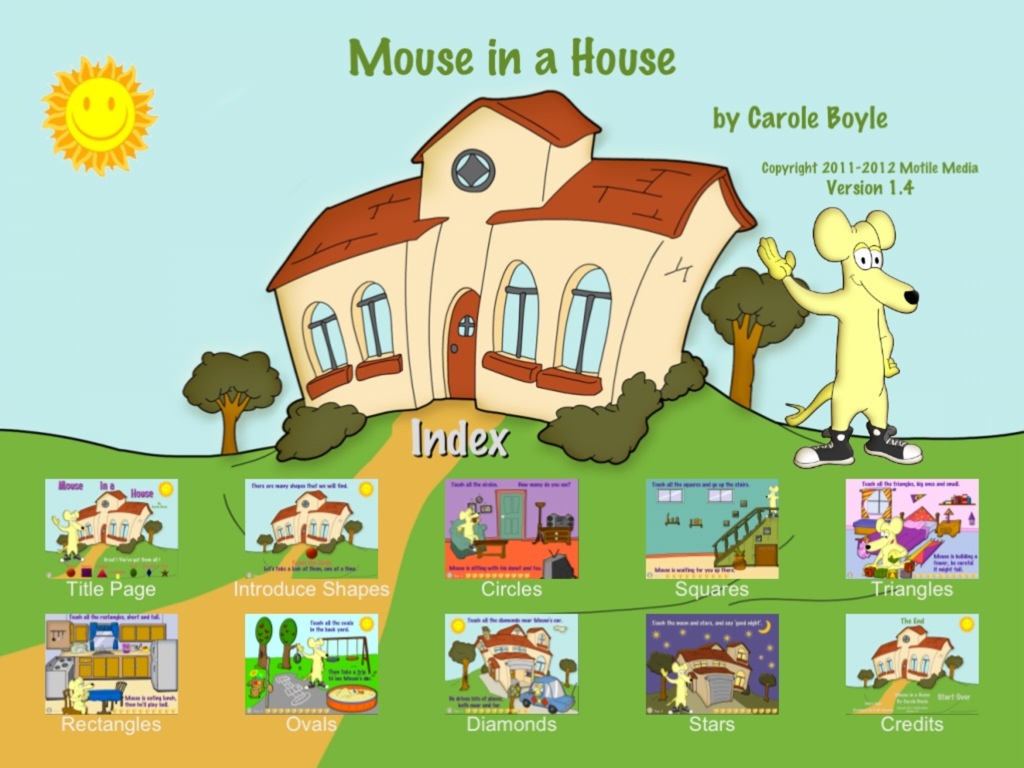 Mouse in a House app (Free) is an iPad game geared to young children who are learning basic shapes. Each shapes is hidden in one of seven different rooms of the mouse house (circles, squares, rectangles, triangles, ovals, diamonds, stars). One type of shape is devoted to each room and are hidden in everyday objects. Verbal instructions are given to the user at the start of each page, however they are given only once with no opportunity to replay the directions.
