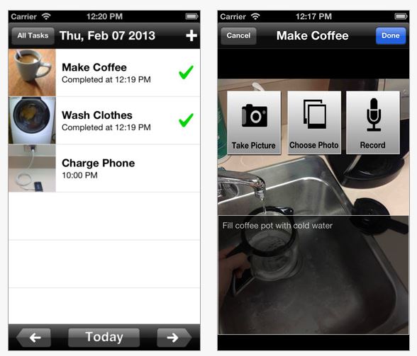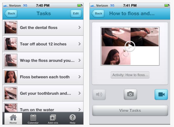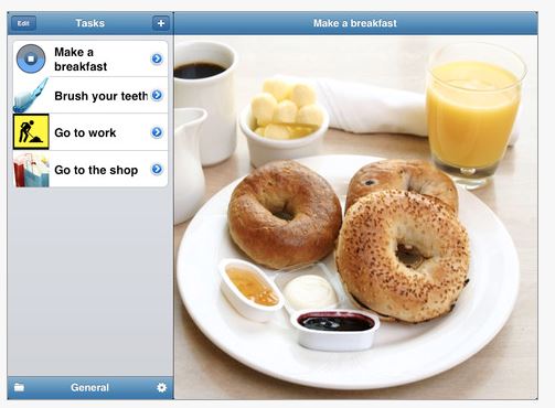 CanPlan App for iPhone and iPad (free with in app purchases) was developed by CanAssist at the University of Victoria. Provides customization with images, audio and speech. Views provide day and week views of task lists. Settings provides numerous methods of customizing alarms, audio and speech, what features are included in the views including task icon size. The free version is limited to 3 tasks. Unlimited task entries costs 44.99.