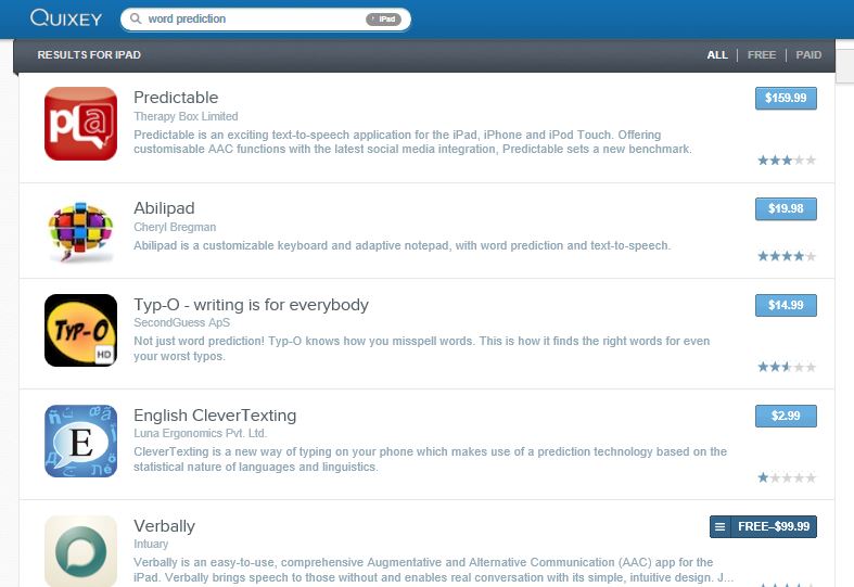 A search using the subject word prediction generated the following list (there are many more in the list) resulting in many familiar apps with word prediction as well as unfamiliar app names. Cost, rating, developer and brief description is listed with a link to an expanded view of information.