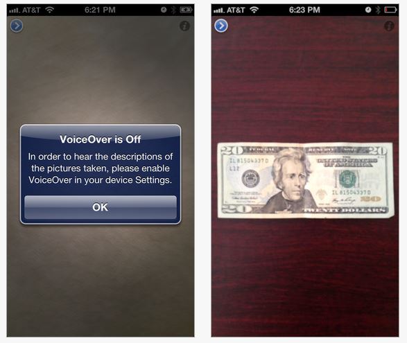 Thomas C. Weiss’ review from Disabled World reported that TapTapSee was an easy to use app. That is no exaggeration. It provided prompts for turning on VoiceOver to make sure it would operate. With only two buttons on the screen and voice prompts given (a play or review button and information button) problems occurred were typically due to operator error. The app identifies bills, colors as well as object and basic labels: