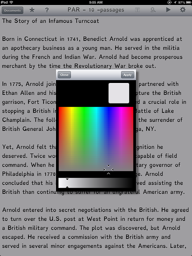 2. Specific iOS reading apps provide back ground color options which can customize the background by chosing a color from the full color spectrum palate.