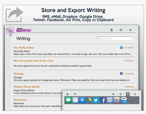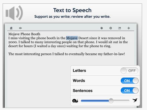 Co:Writer predicts the intended word with a selection of word suggestions using powerful grammar-smart word prediction. These suggestions can be read aloud with a swipe. Selecting the intended word places it into the document. For feedback while writing (and after writing) built-in text to speech can be used to read letters, words, sentences, and the entire document.