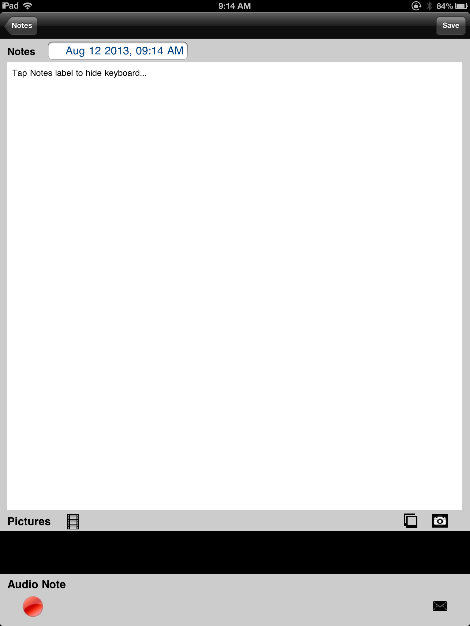 The note page allows options of taking a picture, importing a picture as well as creating an audio note when needing to annotate information on a therapy session on the fly. Notes created are populated with a date and time stamp automatically inserted. Workflow of the notes can be emailed individually or using the button “Mail All Notes” for archiving or use in other programs.