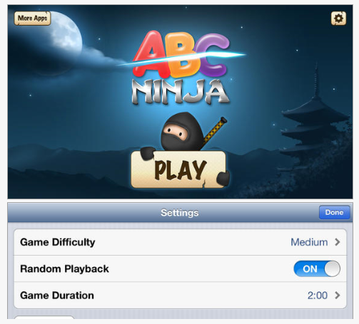 Presented in a clean, customizable app, Ninja ABC app offers three levels of difficulty (easy, medium, hard), duration of play (from 1-10 minutes) and turning on and off any of the upper or lower case letters or phonics for users specific learning needs.