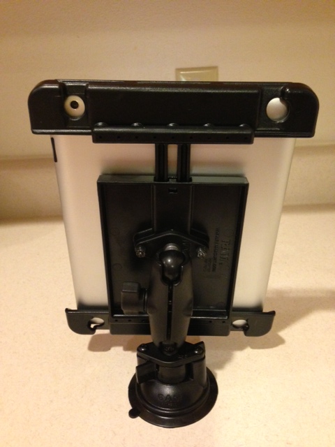 2. The stands cradle holds the iPad using a spring-loaded mechanism that adjusts to fit iPads 1, 2, 3 and 4 (I did not try the new Air iPad). It fit securely in the cradle with no play allowed. This RAM mount stand fits an iPad with a Otterbox case.