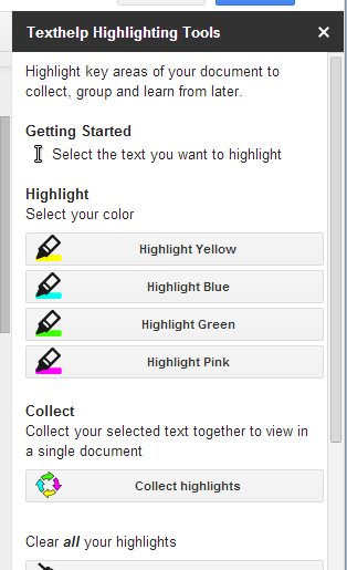Texthelp highlighting tool iconTextHelp Study Tool app (currently free) provides the highlighting tools (yellow, blue, cyan, green) and the ability to collect highlighted text by position or color and create a new document. Highlighting tool opens to the right of the doc for easy access.