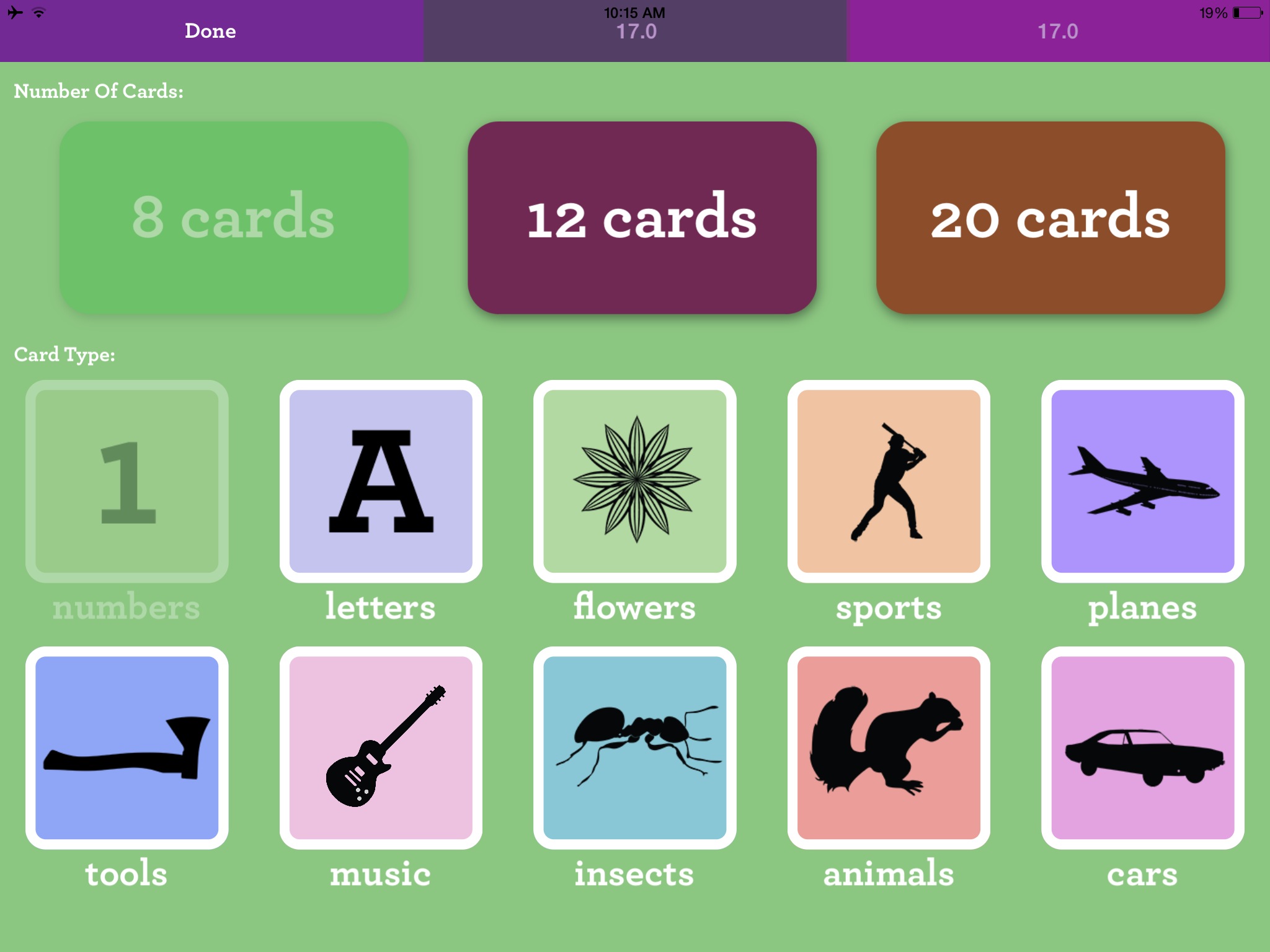 Matching – Memory Training app currently free for iPhone/iPad provides an electronic concentration game for young and old. Developed by the trusted folks at Ellie’s Games, this app could be a staple for those working with a variety of age groups. Although it is promoted for toddlers the content is ageless providing a visual memory tasks for toddlers through geriatric populations due to the black silhouette images, letter and number content. The app provides options of 8, 12 and 20 cards, number, letter, tools, insects, animals, cars, sports, planes, cars, music and flowers image categories and 1 and 2 players.