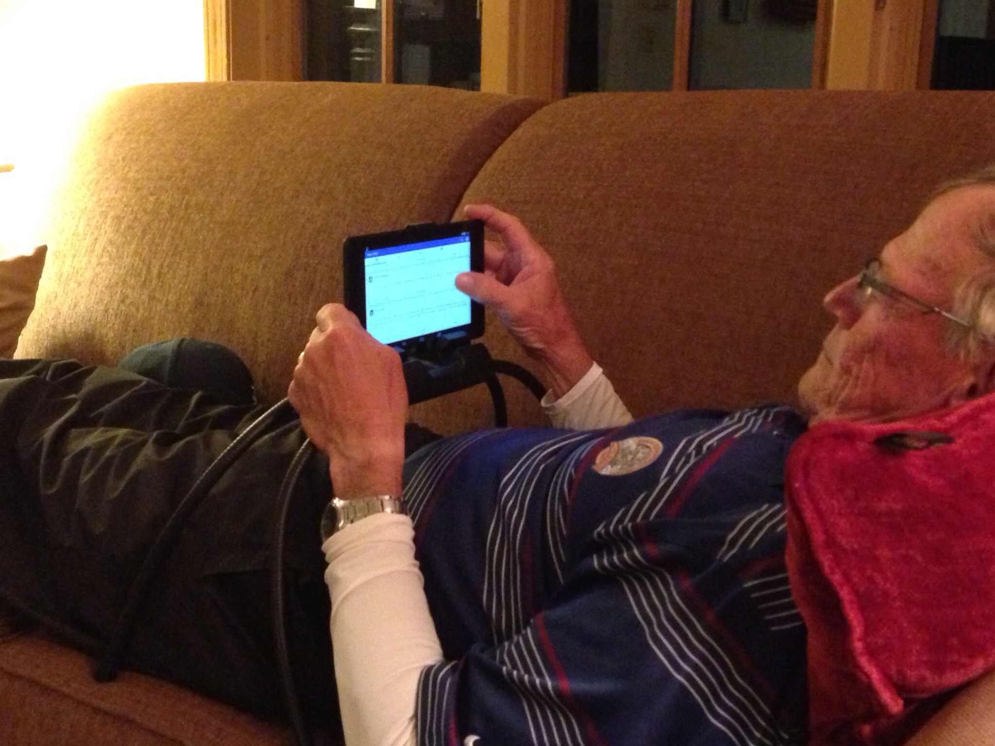 I had some assistance with trial of the stand and was able to observe the position and manipulation with its use. Positioning a device when in a reclined position can require reaching against gravity for operation, depending on the height and placement. This can be a challenge for clients with weakness or pain or just fatiguing for a typical user. Although the user in the picture below does not have motor challenges, it was interesting to observe how the stand legs became a stable resting surface to his arms and hands and how easily a thumb or finger could be positioned to scroll or tap on the touch screen for device navigation. The height and configuration of the stand allowed upper arms to remain supported with hands free for manipulation. Viewing position was comfortable, providing appropriate viewing angle when reclined – especially for us those of us wearing bifocals who experience aging-in-place changes like presbyopia!