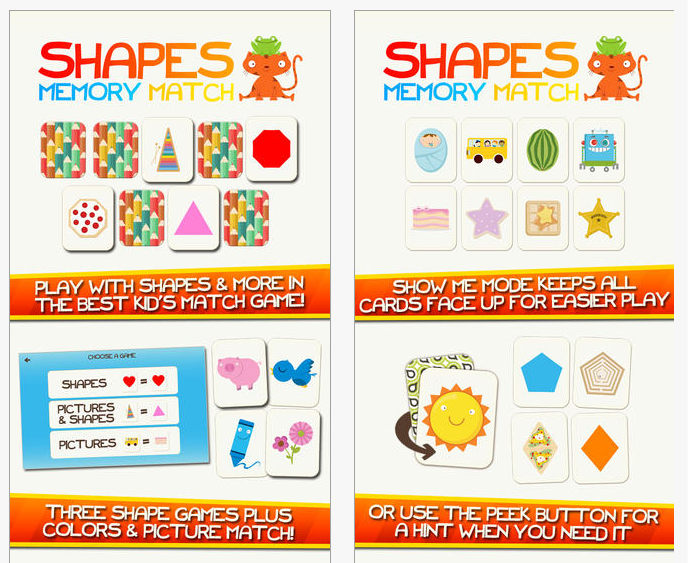 Shapes Memory Match (iPhone/iPad, originally 3.99) is currently free. The app provides preschool activities of shape identification and recognition in a memory matching activity.