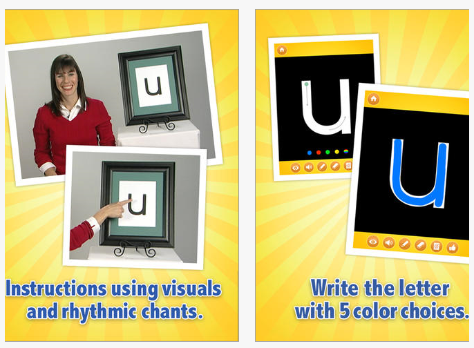 The TV Teacher app provides video modeling instruction, opportunity to practice letters out of order, practice to draw letters and also draw pictures along with phonic instruction. Rhythmic chant for each letter, two levels of practice- one with structured instruction with dots and arrows for letter formation and unstructured practice of writing letters and drawing. Colored lines options are available for drawing.