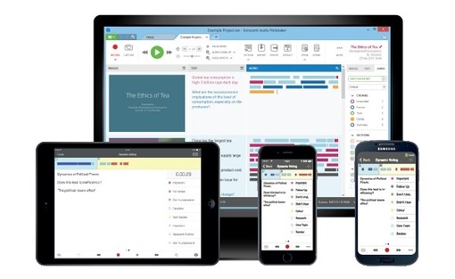 A free Sonnocent Audio Notetaker app is available for iPhone and iPad for recording, then synchronization to the computer based software for organizing with handouts, review, additional note taking, and color coding .