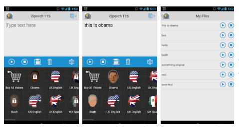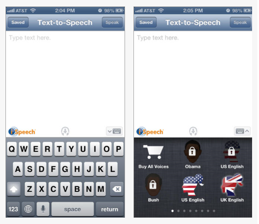 iSpeech app for iOS for iOS (free; iPhone/iPad) – Provides a simple word processing environment with “Speak” capabilities. Very simple and straight forward app. A save function for typed text is available. In app purchase of additional voices are available. Uses Internet connection for text to speech.