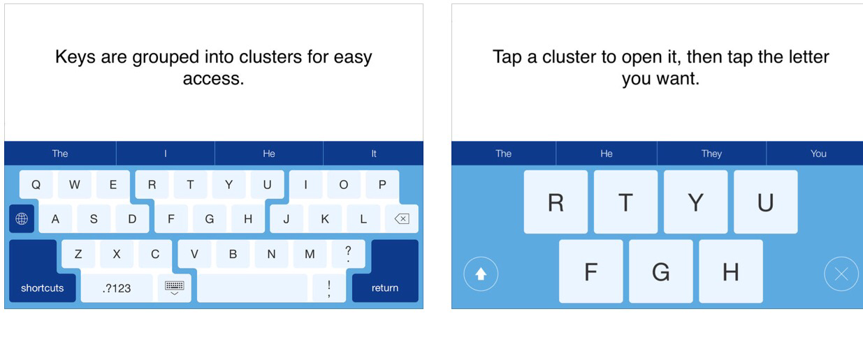 Trial of the use of different input methods found SuperKeys keyboard app (iOS; 14.99) provided direct access to support his motor and visual needs. SuperKeys app, a third party keyboard developed by Crick, is an iOS QWERTY keyboard with 5 main cluster key areas. Once tapped a cluster key area is tapped it provides enlarged keys of the cluster (see below images). This provides a larger key allowing easy access for individuals with motor control challenges. Applying this iOS third party keyboard and turning off repeat rate provided the client the ability to access the tablets keyboard and type. SuperKeys keyboard app provides the following features: