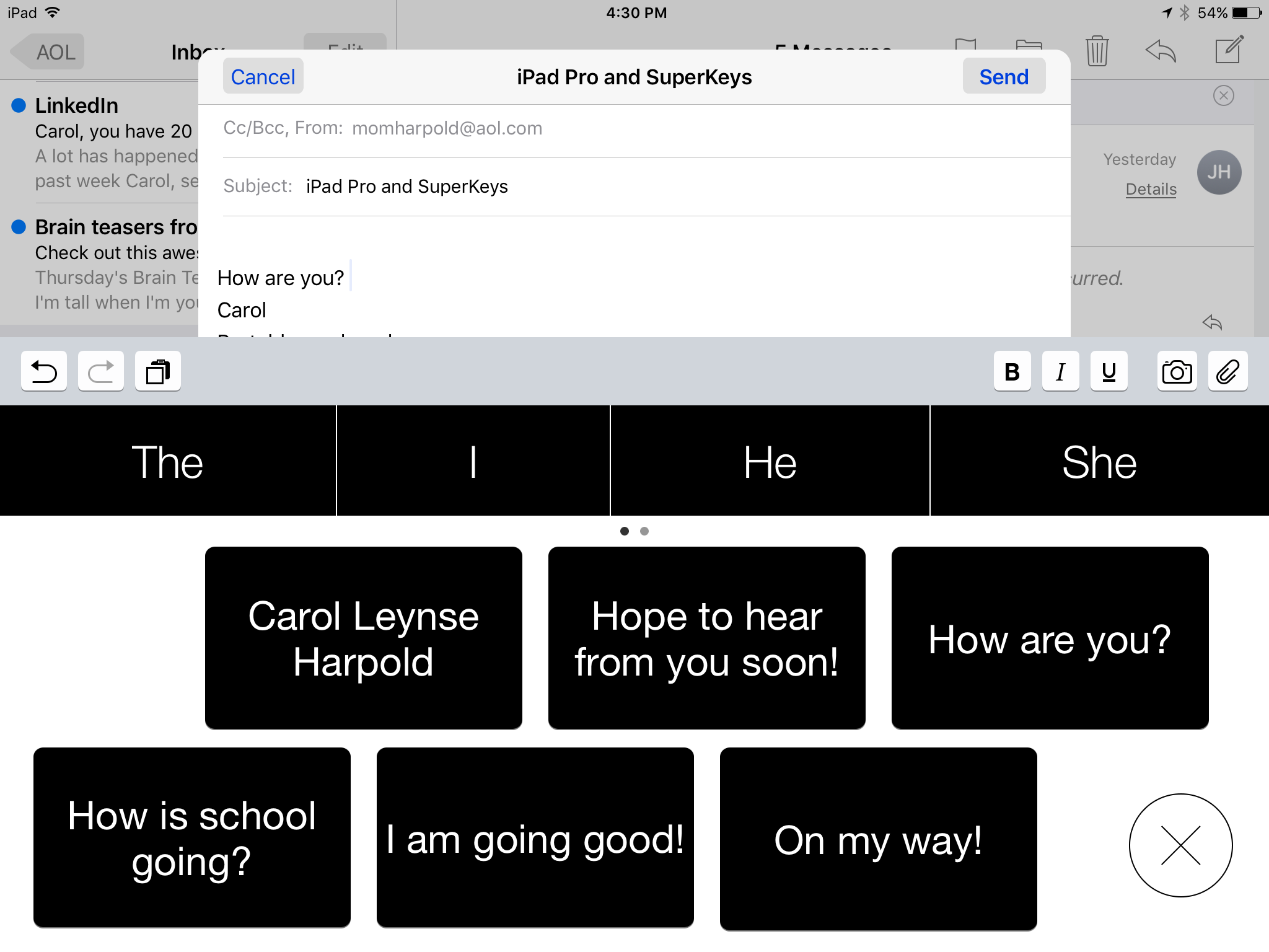 Although typing was slow, it was possible for the client to create messages and view contents of the iPad, social media (Facebook) and email menus, text, app icons and tools with Zoom set to the highest setting possible on the iPad 12.9″. Using the iPad Pro 12.9″ , the adaptive keyboard app SuperKeys and accessibility options allowed the client the ability to communicate with family and friends.